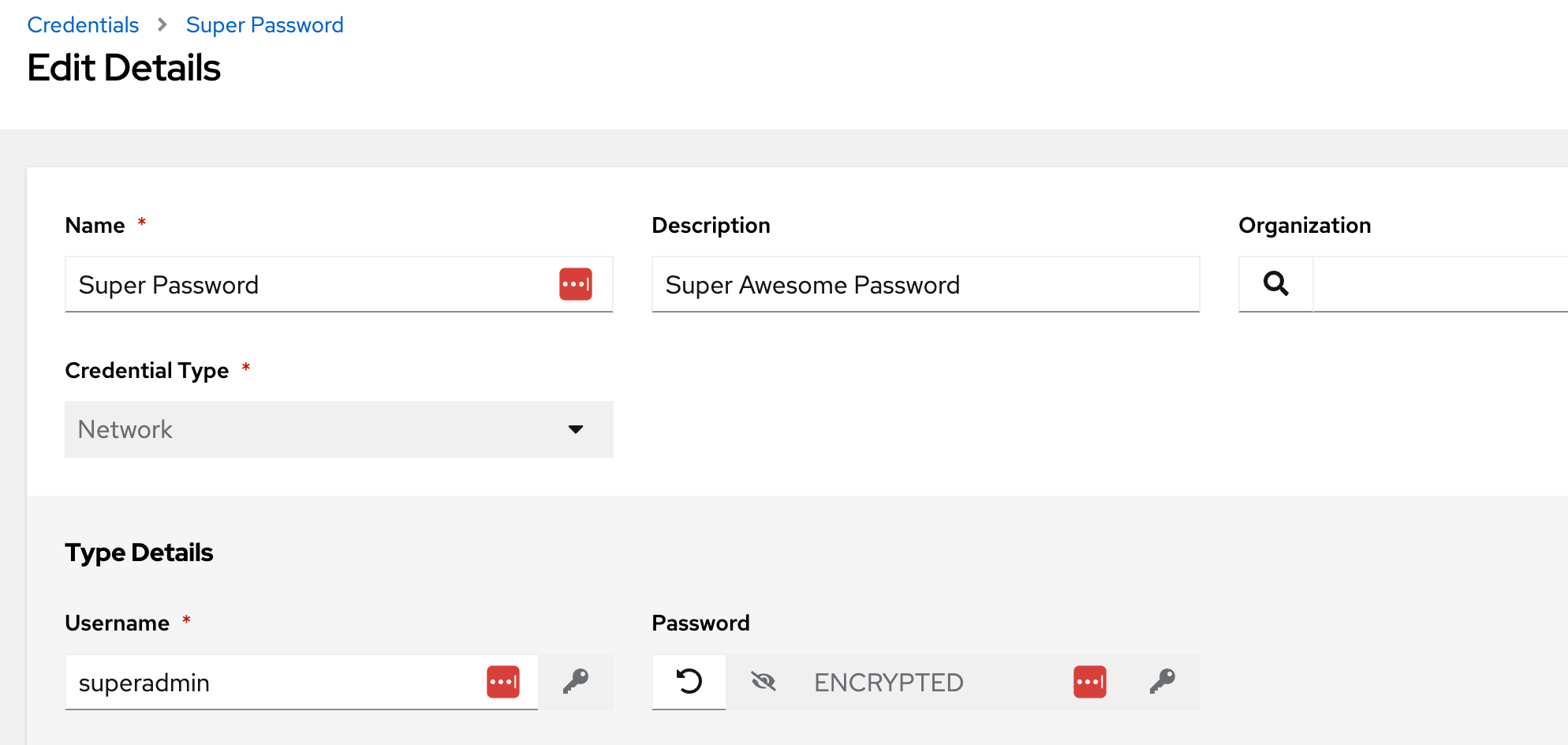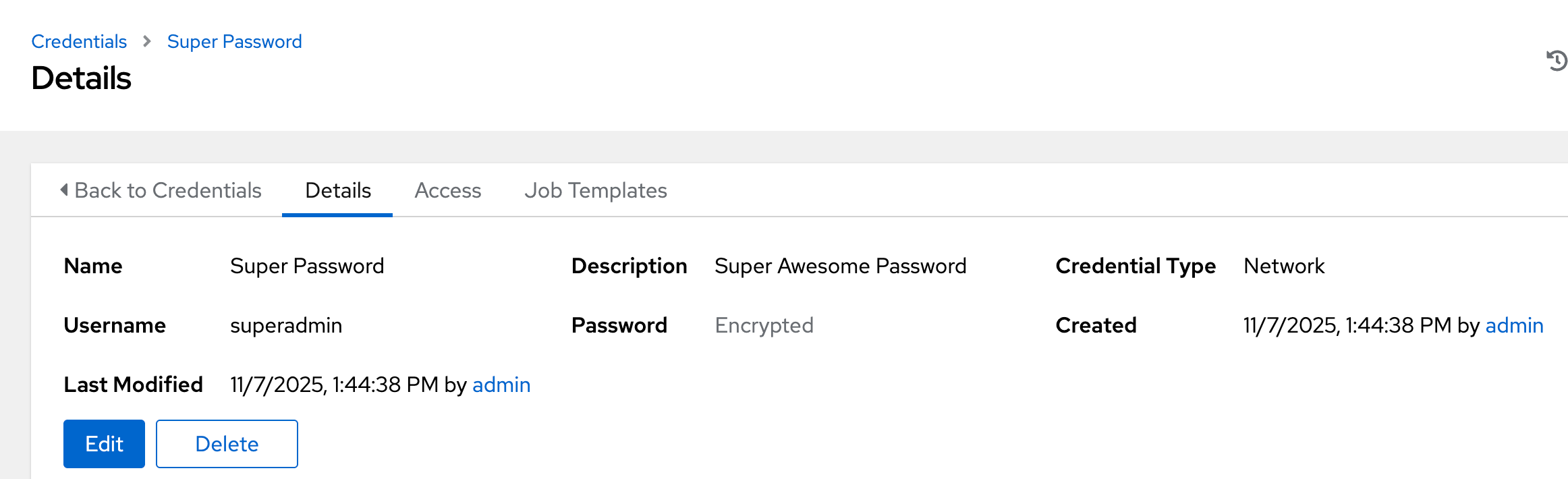 Figuring out how this interpreter can help us interact with credentials was a real pain, but after sifting through archaic documentation for AWX, user forums, and some pretty spotty AI hallucinations, we were able to put together some building blocks of getting credentials.