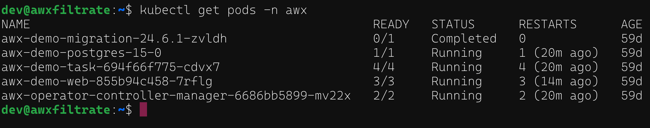 There are a few pods associated with AWX, but the ones of interest will be the ones with the keyword task in the pod name. These are the pods that run containers associated with the backend services such as redis, databases, and most importantly, tasks. If we take a look at the containers being hosted in the awx-demo-task-... pod, we can see a container called awx-demo-task
